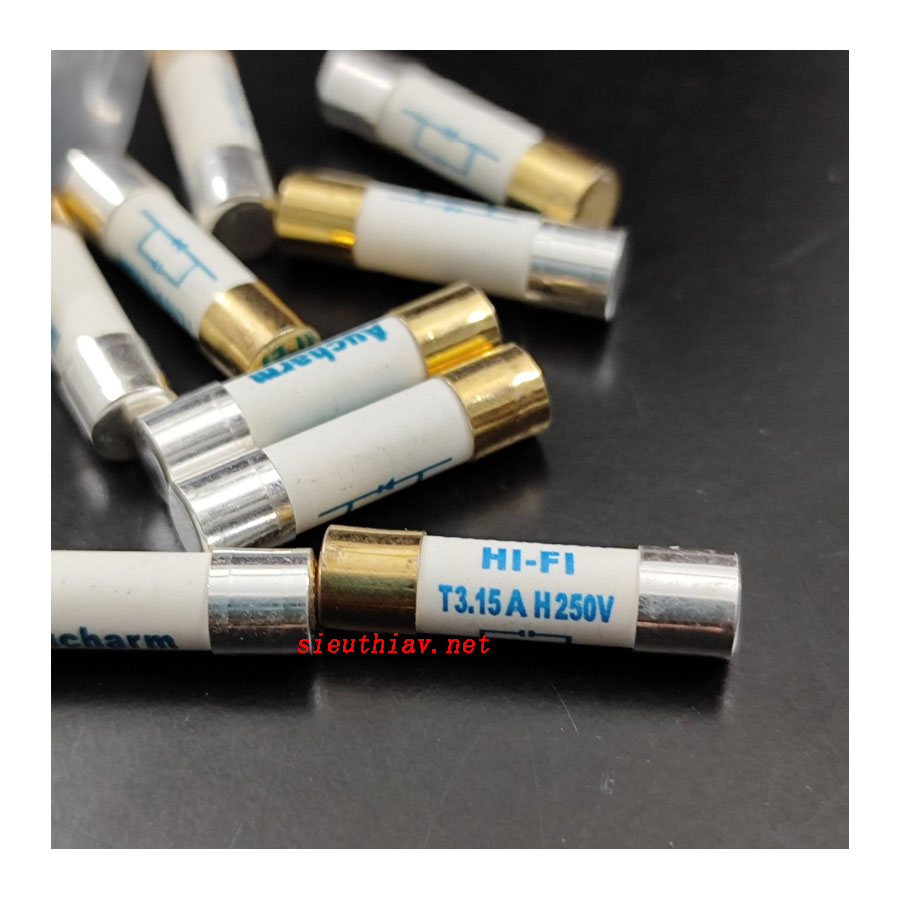 Cầu chì cháy chậm Aucharm 3.15A kích thước 5x20m với 1 đầu bạc và 1 đầu vàng.