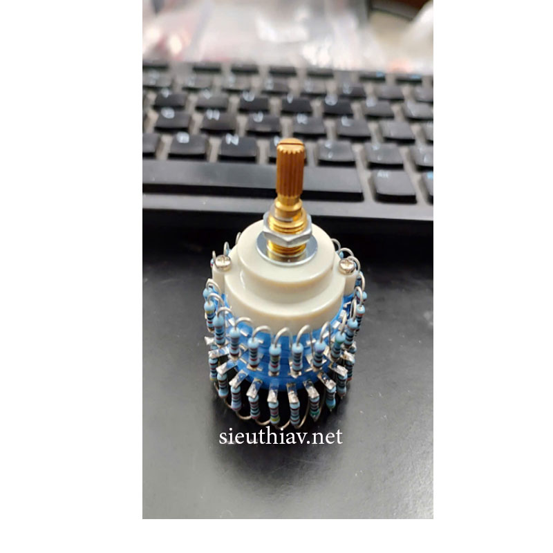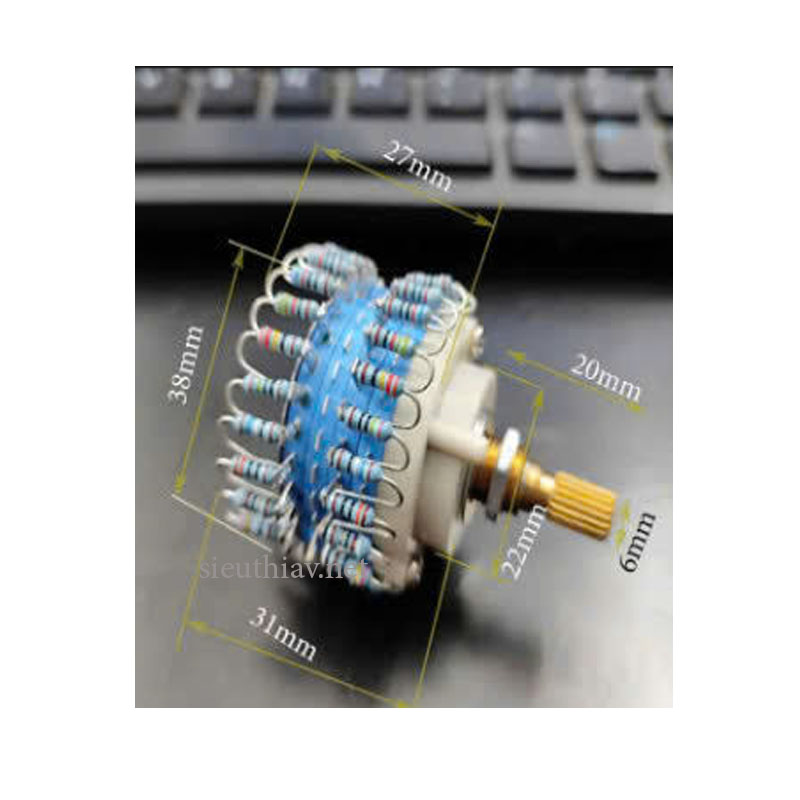 Chiết áp 2 kênh 24 bước sử dụng điện trở KOA 0.25W Chiết áp do Đài Loan sản xuất với 46 giá trị điện trở KOA sai số dưới 0.5% Kích thước đường kính 40mm, chiều dài thân 35mm, chiều dài tay cầm 12mm, tổng chiều dài 50mm. Đơn giá/01 chiếc