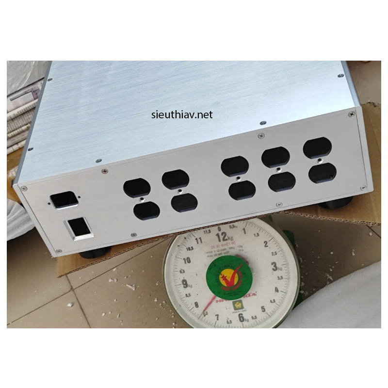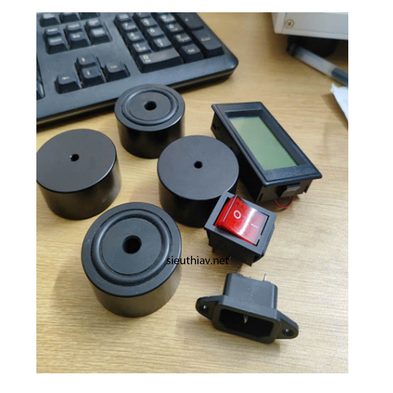 Phụ kiện đi kèm gồm: 04 chân nhôm phay, 01 đồng hồ hiển thị vol, 01 socket nguồn, 01 công tắc bập bênh