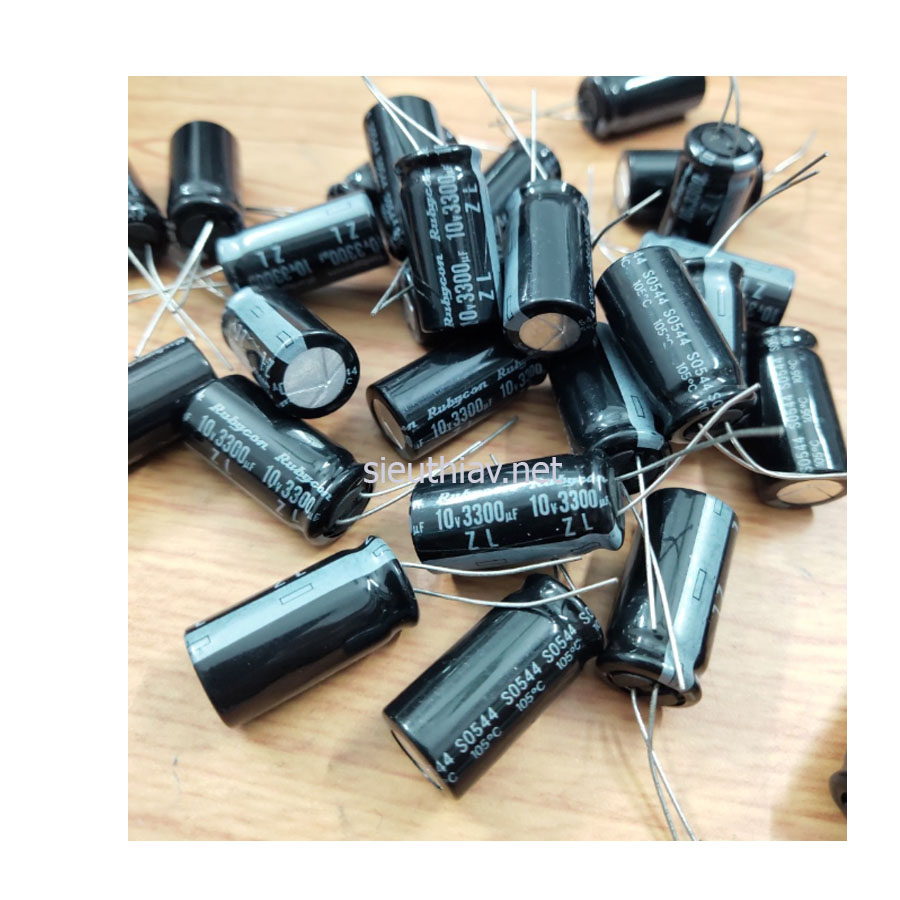 Rubycon ZL 3300uF-10V. Đường kính 12mm cao 25mm, khoảng cách 2 chân tụ 5mm.